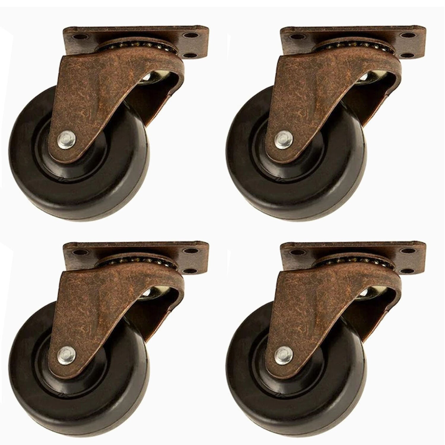 Old style antique bronze swivel casters great mobility accessory for any project. These swivel casters are made of real heavy metal and rotate 360 degrees. Strong construction, old world look and feel, and are really cool! Each caster has a 4 screw plate on the bottom for universal application.