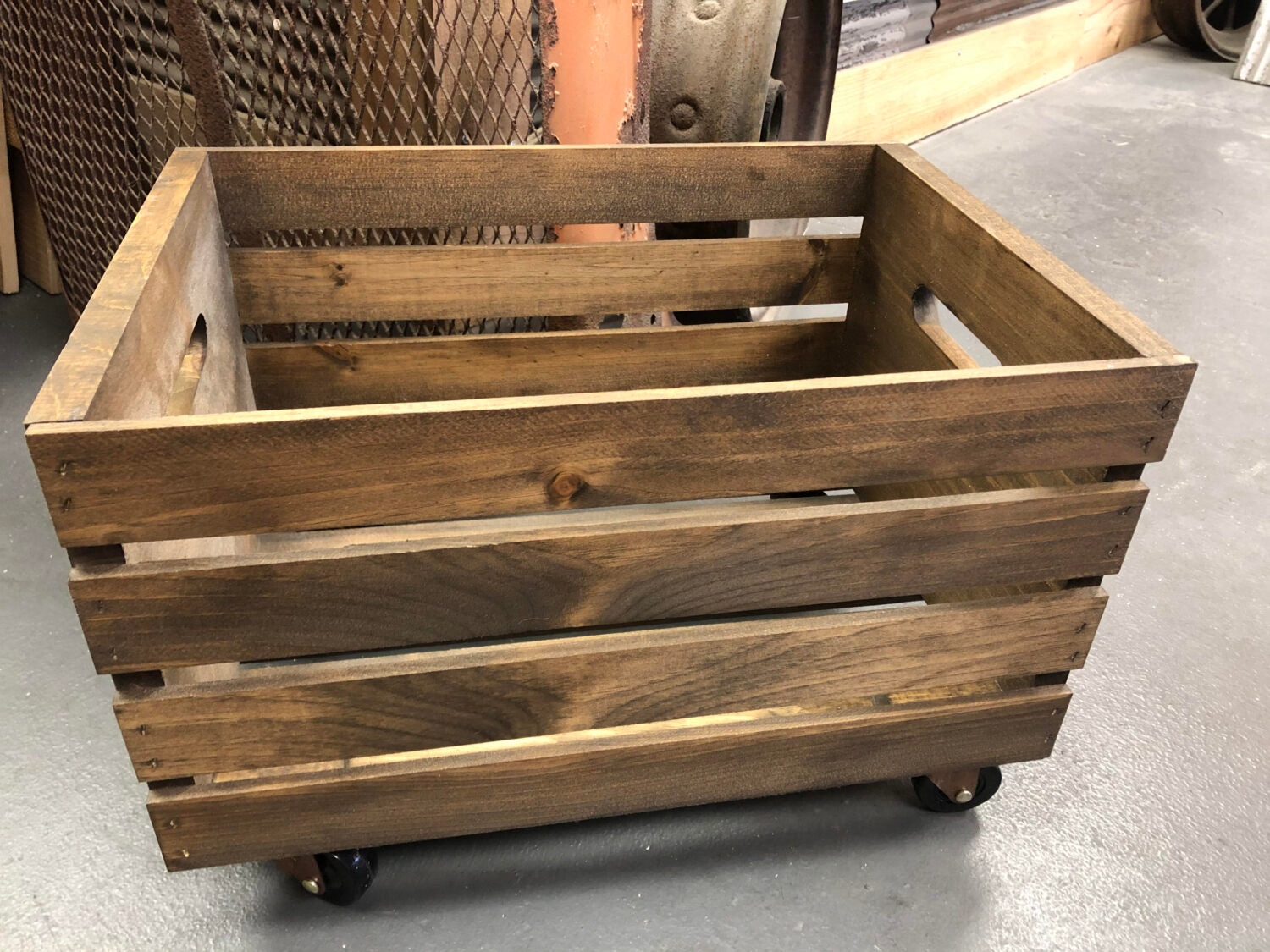 This Dark Walnut color version of our famous wooden crates with wheels features antique style casters for storage in your home or office with a vintage rustic appeal. Now you can have the old fashion reclaimed look without all the digging around in the woods in the new dark walnut color! The Pistol Pete's Rustic Wooden Crate has a fresh vintage stain and finish and the strength of a brand new wooden crate. The antique style casters complete the statement and top off a great rustic appeal to any space.