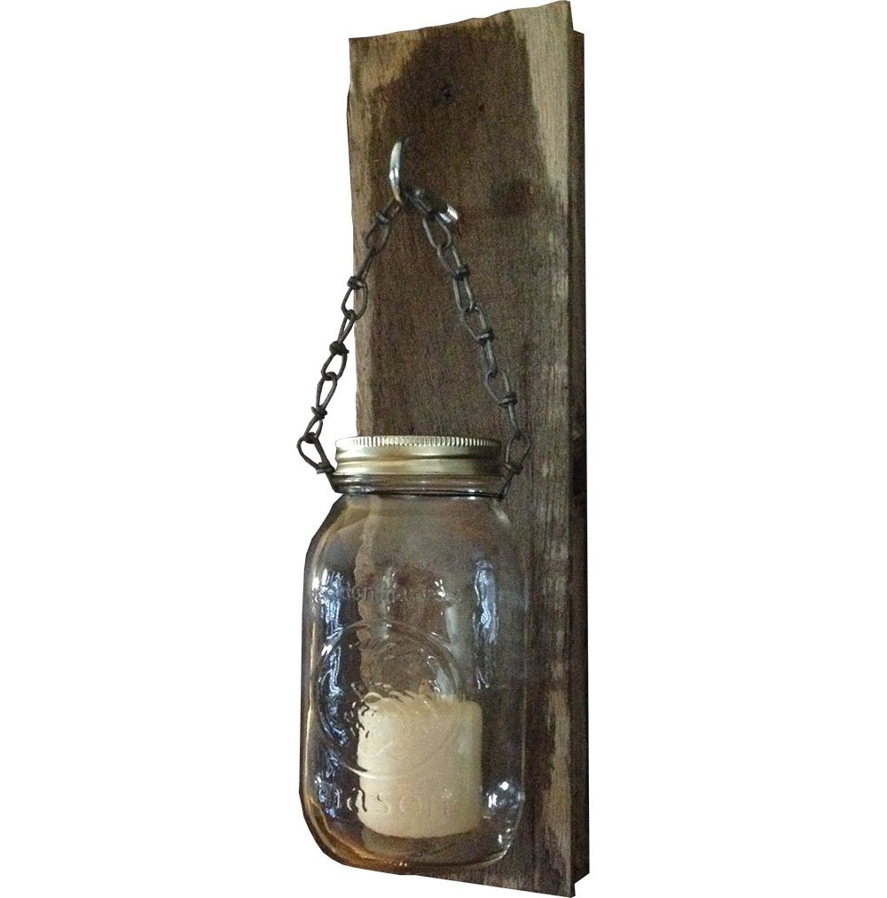 Looking for a unique addition to your home or for a great housewarming gift? Well, you found it! A unique lighting experience that has that antique feel that your home needs! Each hand made mason jar candle holder fixture features aged found wood that has great character. Light up these mason jar candle holders for a low light, rustic room addition that is sure to catch the attention of your visitors. Each set will vary slightly in wood features and color. We leave that up to mother nature!