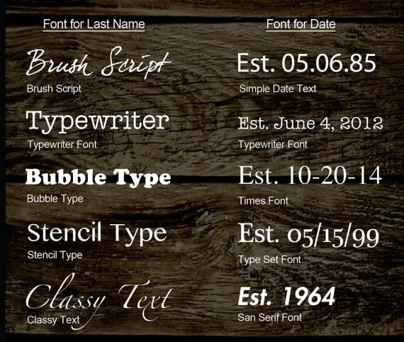 Start by choosing Last Name Font, Date Font and Hanger Type. Then Add to Cart and complete the below steps to complete your custom Wedding Date Sign order.
