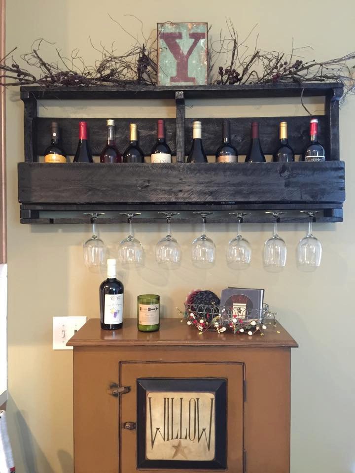 Our rustic farmhouse style wine rack with top shelf makes a great piece for your home! Get the Pistol Pete's Pallet Wine Rack for your bar, kitchen, basement, garage or any space you want to decorate with a woodland, rustic or farmhouse feel. Wine Rack holds 8 glasses of many sizes and shapes and around 8 bottles. The top shelf makes a great place to display pictures of friends and family, store bar accessories and more.